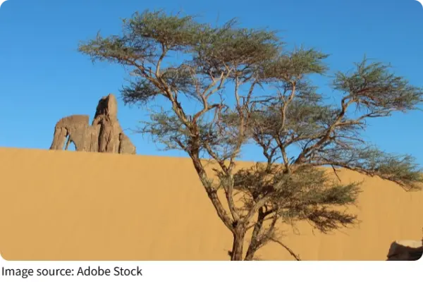 One of Ennedi’s best‑known formations is the Arche d’Aloba, a soaring sandstone arch around 120 metres high with a span of roughly 77 metres—among the largest natural arches on Earth. Elsewhere, weathering has created smaller arches that resemble musical instruments or animals, along with pillars that stand like chess pieces on the sand. Deep canyons, some stretching for tens of kilometres, cut through the plateau and often end in wadis or small gueltas fringed with vegetation. Typical days combine drives across open sand plains with short walks into these rock “cities,” returning to bush camps as the evening colours intensify.
